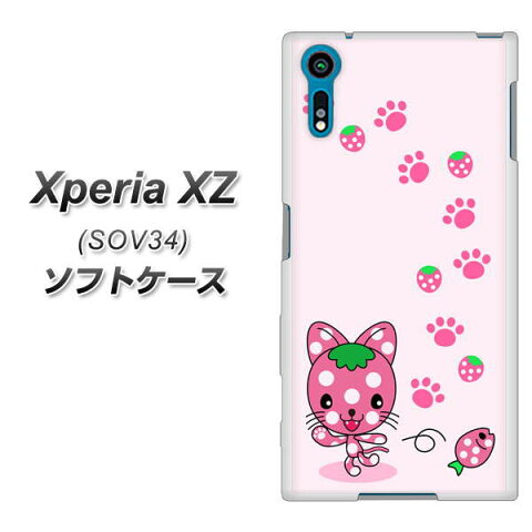 au Xperia XZ SOV34 TPU ソフトケース / やわらかカバー【AG819 イチゴ猫のにゃんベリー(ピンク) 素材ホワイト】 UV印刷 シリコンケースより堅く、軟性のあるTPU素材(au エクスペリアXZ SOV34/SOV34/スマホケース)